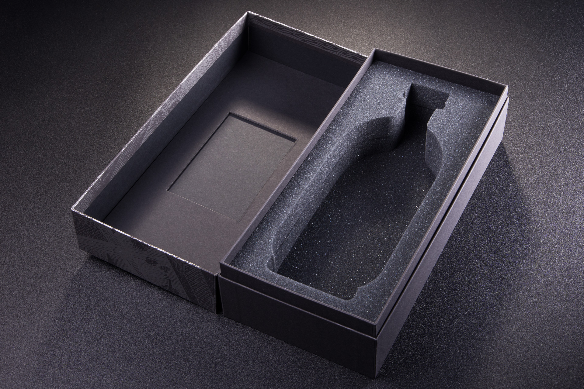 Należy zwrócić uwagę, że miejsce wycięcia na buteleczkę ma również kolor czarny. Dodatkowo na wkładce został wykonany hot-stamping w kolorze złotym
