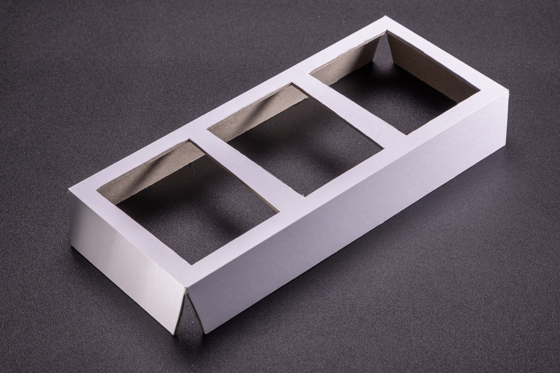 Przekrój wycięć szary. Po wyciągnięciu produktów widoczna również szara powierzchnia tektury.